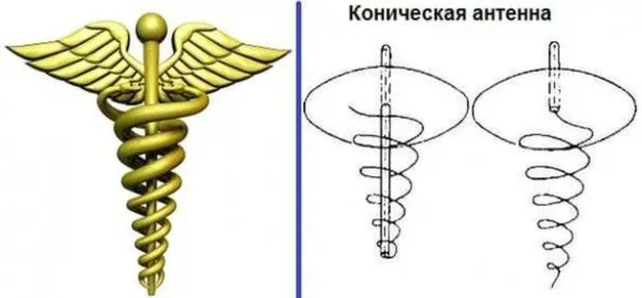 Кадуцей выглядит как жезл, по которому спиралью завиваются змеи – и он очень похож на коническую спиральную антенну.