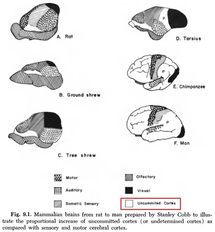 Нижеследующая иллюстрация демонстрирует результаты сравнительного анализа предназначения коры больших полушарий головного мозга. Исследования проводил выдающийся нейробиолог Уайлдер Пенфилд, который совершил прорыв в этой области в середине XX века. Эти изображения иллюстрируют предназначение различных областей церебрального кортекса у различных видов млекопитающих (масштабы изображений, естественно, разные):