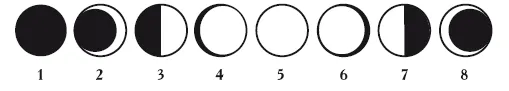 1 – Новолуние, 2 – серповидная Луна, 3 – первая четверть Луны, 4 – выпуклая Луна, 5 – Полнолуние, 6 – рассеивающая Луна, 7 – последняя четверть Луны, 8 – бальзамическая Луна.