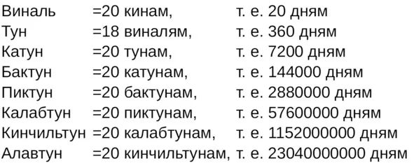 В конце IX в. отмечаются самые поздние даты по системе «Длинного счета». С этого времени начинается закат культуры майя в центральной зоне и вторжение иностранных захватчиков. Теряются многие знания, относящиеся к сложной календарной системе. Мы не имеем записей дат в течение почти шести веков, хотя жрецы майя продолжали подсчитывать прохождение времени в очень укороченной форме, как об этом говорят книги «Чилам-Балам», сообщения Ланды и другие документы XVI в. Мы называем «Коротким счетом» систему, которую майя называли. У Кахлай Катуноб, то есть «счет катунов». Катунический цикл, или «колесо», состоял лишь из 13 катунов, в силу чего определенная дата повторялась по истечении этой серии из 13 катунов, или немногим более 256 лет. Катун именовался по дню Ахав, в котором он заканчивался.