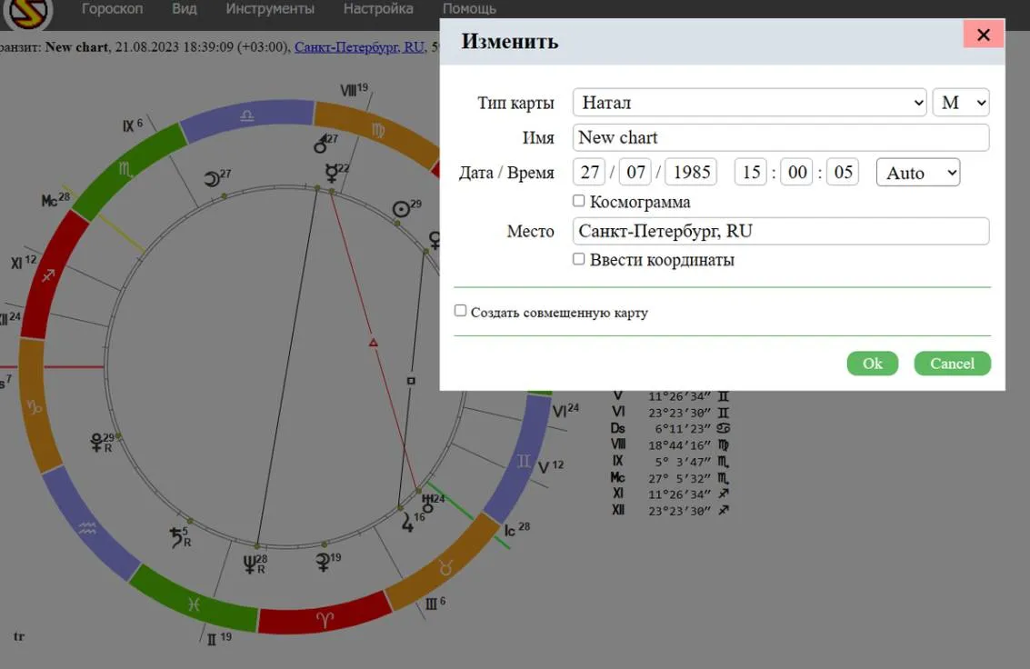Вводим свою дату, месяц, год и время рождения. Выбираем город рождения. Нажимаем «Ок»