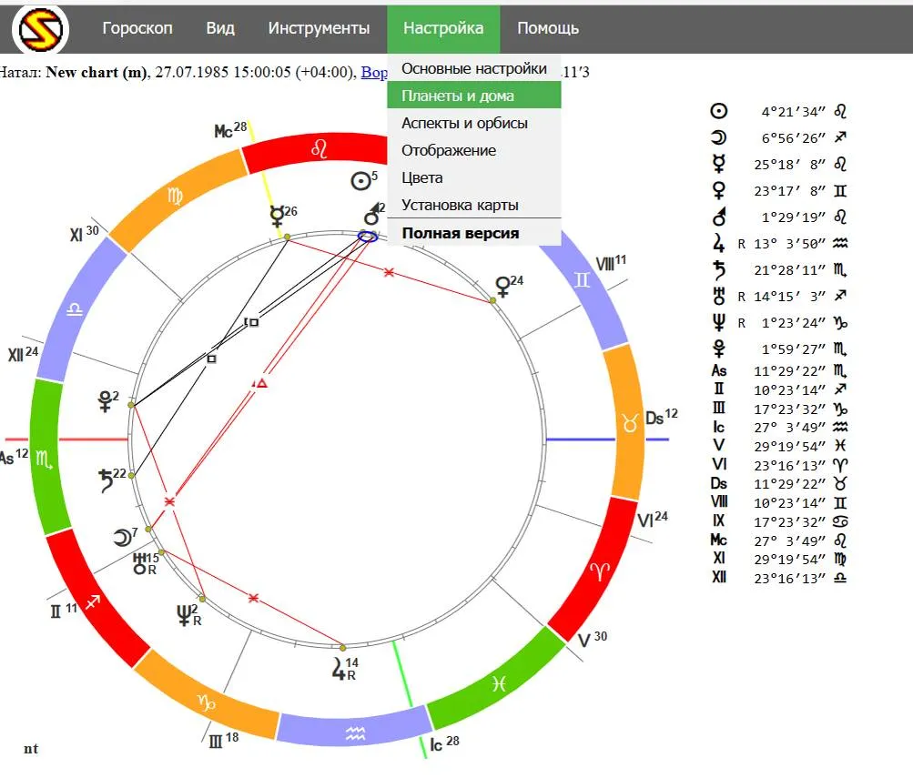 Строим натальную карту в онлайн программе «Ведик Хоро» для ведического гороскопа и «Сотис» для западного гороскопа.