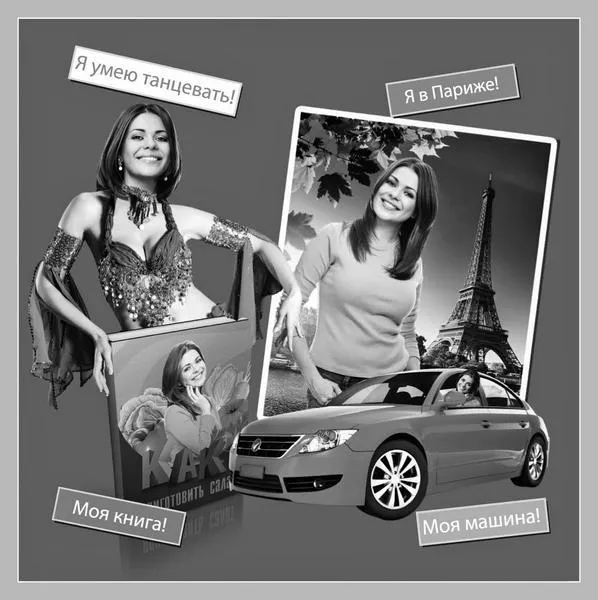 Коллаж Мечты только тогда будет Коллажем, когда мы соединим себя и нашу мечту: разместим себя на фоне моря, посадим в машину, присоединим нашу голову к роскошной фигуре и т. д. Если на одном листе будет несколько Коллажей Мечты, то это все равно Коллаж, просто большой.