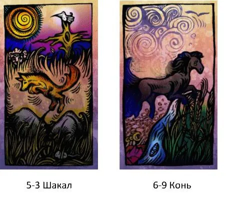 4. Косвенная односторонняя, глиф к отличному глифу. В двух картах присутствует схожие по смыслу или символизму глифу, но немного отличные, по существу, и изображению. Связь работает в одну сторону. Как правило здесь глифы могут даже значительно отличаться, но иметь схожий посыл в контексте карты, при этом работает в одну сторону. Хороший пример карта 5-3 Шакал и карта 6-9 Конь связь по глифам «Шакал» и «Конь» соответственно. Здесь шакал может трансформироваться в коня, так как несет схожий посыл об изменении энергии, но если брать карту Конь, то она дает в целом другой посыл и её глиф не может уже обратно отсылать на карту 5-3 Шакал.