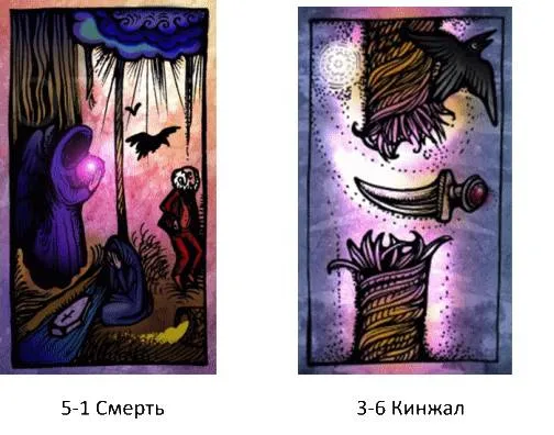5. Прямой к карте. От глифа к целой карте. Глиф одной карты как отсылка к другой карте в целом. Например, карта 5-1 Смерть глиф «Канат и ворон» отсылает нас напрямую к карте 3-6 Кинжал.