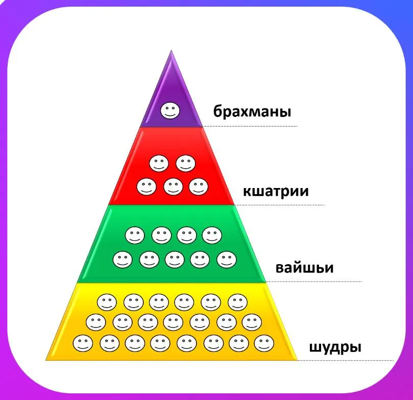Шудры – самый нижний уровень в структуре населения и, разумеется, самый большой. Здесь находятся все люди, которые в обществе считаются рабочим классом – лошадки (и поле спашут, и всю работу за тебя черную выполнят), главное, – вовремя дать им корку хлеба и воды. Я намеренно сгущаю картину, чтобы вы прочувствовали энергии, которые стоят за каждой кастой в старом представлении, это нам пригодится в дальнейшем.
