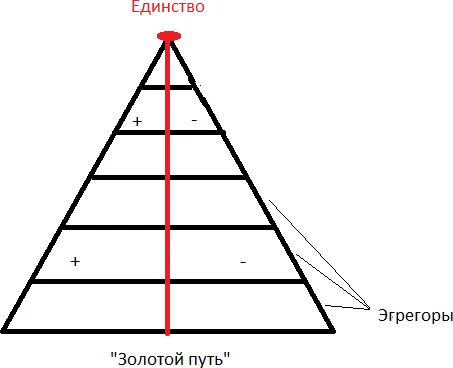 На данном рисунке, горизонтальные линии – это разные эгрегоры. Чем меньше расхождения, между «+» и « – » полярности, тем ближе они к балансу и их вибрации выше. Их можно назвать светлыми эгрегорами. Чем больше разбалансировка, относительно линии «золотого пути» (баланса), тем они вибрационно ниже. Нужно обращать внимание на то, куда больше смещен эгрегор. В область отрицательных мыслей и эмоций (чем он питается) или положительных. Эгрегоры разной полярности создают различные конфликты, на непримиримости взглядов, концепций, идеологий и многого другого. Линия «золотого пути» – это путь ухода от влияния эгрегоров. Путь, который подразумевает осознанное Единство, и умение осознанно контролировать мысли, эмоции и чувства, не питая их. На вершине пирамиды показан полный уход от влияния всех эгрегоров, полное осознание Единства: нет врага, нет соперника, нет противоречий в поле Единого Абсолюта, есть только безусловная любовь. Осознав полное Единство, можно ощутить полную свободу и безусловную любовь ко всему! Не понимая полного Единства всего, можно испытывать безусловную любовь к чему-то выборочно! И эта разница в мировосприятие очень существенна.