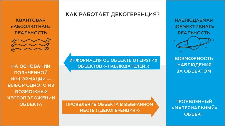 Именно поэтому квантовые свойства, проявляемые частицами, не распространяются на «большие» объекты. У «больших» объектов постоянно есть «наблюдатели». Огромное количество информации, получаемой этими разнообразными «наблюдателями», материализует объект и его свойства в нашем мире.