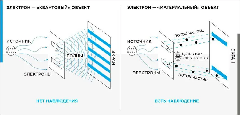 Дело в том, что если, проводя «двухщелевой эксперимент», мы начинаем «подглядывать» за электроном, он перестает вести себя как волна, проходя сквозь обе щели. Под пристальным взглядом он начинает вести себя как частица, проходя в одну-единственную конкретную щель!