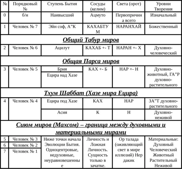 Из таблицы видно, что существует три вида миров: Божественный, Духовные и Материальные. Также просматриваются явные разграничения между всеми уровнями. Человек №1,2,3 относятся к механическому, т.е. несознательному Кругу человечества. Человек №4 относится к промежуточному Кругу человечества. Человек №5,6,7 относятся к Кругу Сознательного Человечества, причем человек №7 к его Божественной части.
