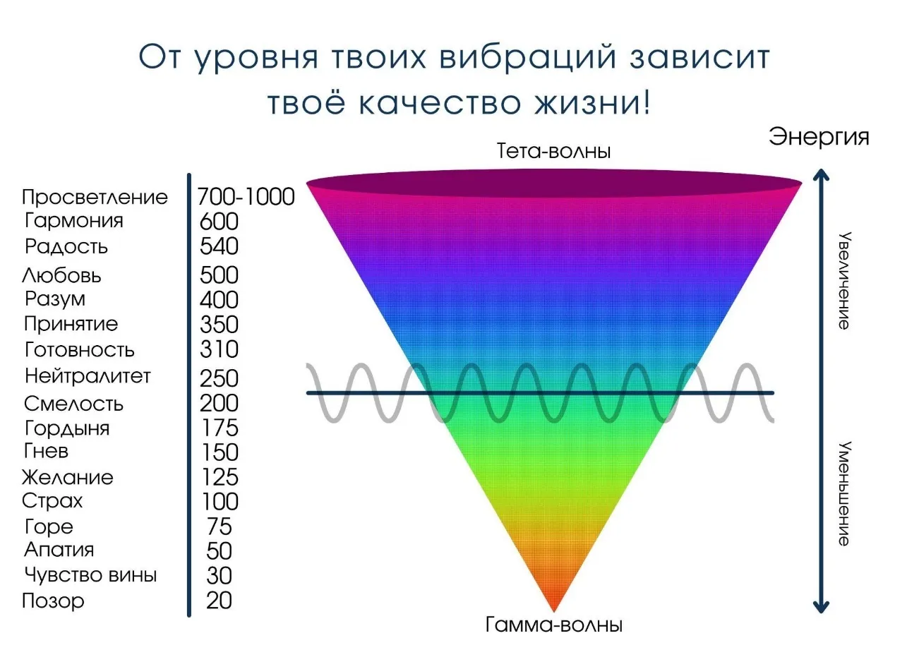 Высокие вибрации = пространство Абсолюта, эмоции Любви, радости, принятия, счастья, прощения.