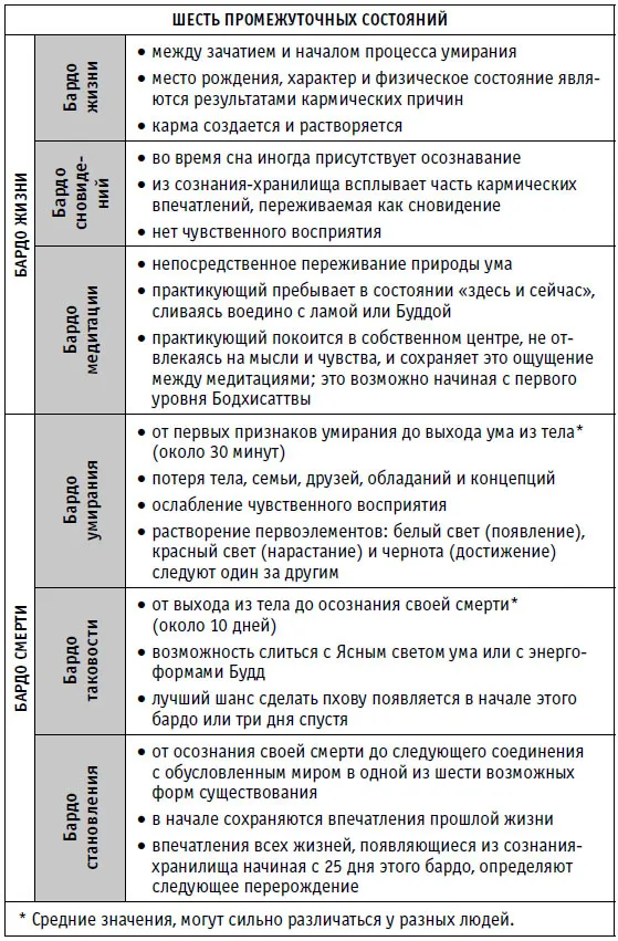 Среди буддийских поучений Тибета более других известна Книга мертвых (тиб. бардо тхёдрёл: «Освобождение через слушание в промежуточном состоянии»). Этот источник, относящийся к VIII веку, принадлежит перу основателя тибетского буддизма Гуру Ринпоче. Широкое признание текст получил во многом благодаря сходству описываемого состояния с появлением света в околосмертных переживаниях, которое отмечается современными исследователями. Книга мертвых объясняет процесс умирания и перерождения, а также пути выхода из этого круговорота. В трех «старых» школах медитации Тибета (так называемых школах красных шапок) было принято читать эту книгу при жизни, чтобы вспомнить ее наставления во время смерти и, попав в промежуточное состояние, немедленно достичь Освобождения. Кроме того, ее читали вслух тем, кто умер и находится в бардо, – это вело их к лучшему перерождению.