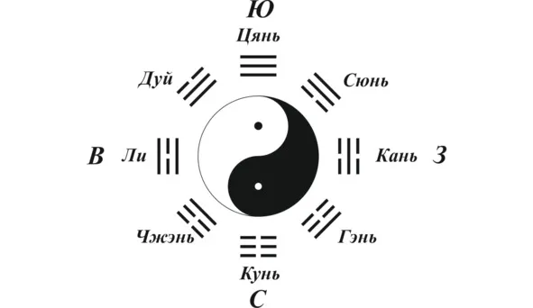 Вначале триграммы располагались по окружности монады в «прежденебесной» последовательности (рис. 2.), в которой не было разделения на пять превращений (У-син).
