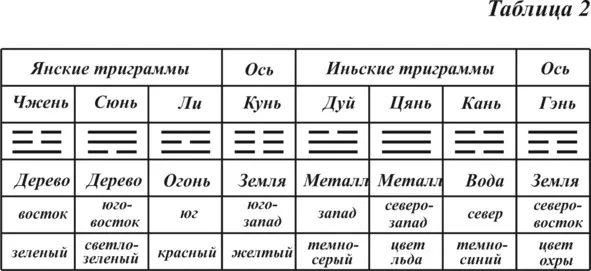 В представленной ниже таблице видно, к какому элементу и с какими сторонами света стала соотноситься каждая триграмма, только уже в «посленебесной» последовательности.