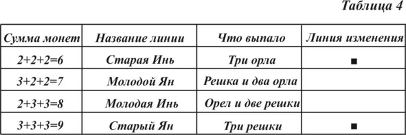 Однако можно взять орел как олицетворение птицы и представить, что он парит высоко в небе, поэтому и берем его как Ян. Поэтому как решите для себя, так и действуйте. Сейчас для объяснения вышесказанного можно нарисовать небольшую таблицу. В ней также точками отмечены линии, которые будут меняться, если при вбрасывании выпадают все орлы или все решки.