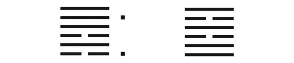 Задаем вопрос, вбрасываем монетки и рисуем получившиеся фигуры. Например, при первом вбрасывании выпало три орла, при втором – две решки и орел, при третьем – два орла и решка, при четвертом – две решки и орел, при пятом – три решки и шестом – две решки и орел. Тогда у нас получится исходная гексаграмма, состоящая из триграмм Кань и Цянь (на рисунке слева), где изменяются первая и пятая линии. (Первой считается нижняя триграмма.)