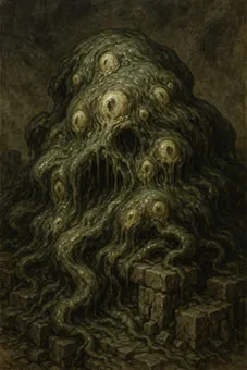 Перед вами – древняя, безликая масса, вздымающаяся из тьмы и стекающая вниз потоками вязкой слизи. Многочисленные глаза внутри этой первобытной глыбы словно символизируют слепое наблюдение, тайные страхи, подавленные желания и боль из прошлого, которые сливаются в неразделимую тягучую субстанцию. Это энергия глубинного бессознательного, – накоплений, которые могли веками оставаться без внимания или вытеснения.