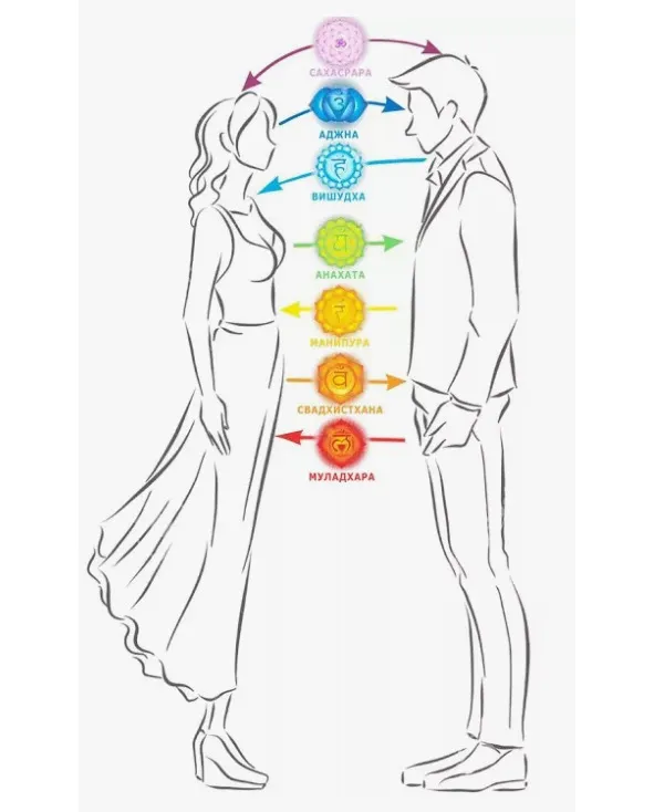 Чакры у женщин вращаются против часовой стрелки, слева направо. У мужчин движение идёт в обратную сторону – по часовой стрелке, справа налево. Это символизирует гармоничное взаимодействие женской и мужской энергии.