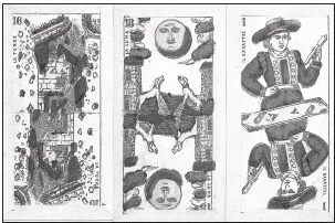 Отражения в Марсельских Таро. В Марсельской серии иконография Луны также наполнена символами зеркальности и перекрёстного отражения. Рисунок на карте из Безансонского Таро, которое называют также Таро графа де Милле, как и в других классических колодах Марсельской серии, демонстрирует как горизонтальные, так и вертикальные отражения: собаки, повёрнутые мордой друг к другу, холмы и башни, а также на вертикальной линии Луна и омар.