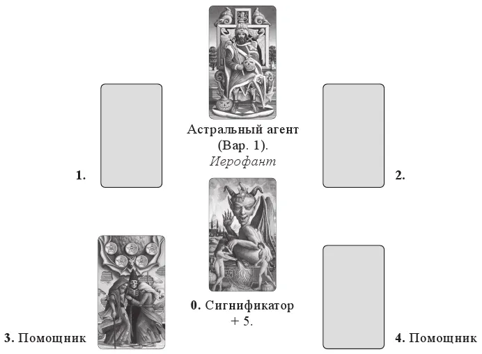 Всё то же самое, только Астральный агент (Иерофант) перемещается вниз, а Помощника олицетворяет 5 Жезлов.