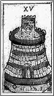 Башня Таро. Сторожевую башню мы видим на карте Таро. Номер XV, проставленный на карте, говорит о том, что она принадлежала к колоде, изготовленной ещё до того, как в них появился Дьявол.