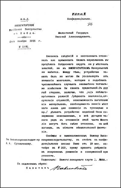Никакихъ сведенiй о постоянных стоянках или временных базахъ аэроплановъ в пределахъ Кобдосского округа ни у местныхъ властей, ни въ Императорскомъ консульстве ни имеется. Между темъ; устройство такихъ базъ не могло бы ускользнуть отъ: вниманiя монголовъ которые о подобныхъ чрезвычайныхъ случаяхъ несомненно тотчасъ-же известили бы своихъ правителей. Съ другой стороны, полагаю, что, рядъ неблагоприятныхъ условiй /редкость населенiя, отсутствiе строенiй, невозможность заготовленiя матерiалов, необходимость знанiя местнаго языка для сношенiя съ туземцами и пр./ делаетъ устройство подобной базы совершенно невозможнымъ и все догадки такого рода въ отношенiи этой части Монголiи могут быть смело отнесены, на мой взглядъ, къ области обывательской фантазiи.