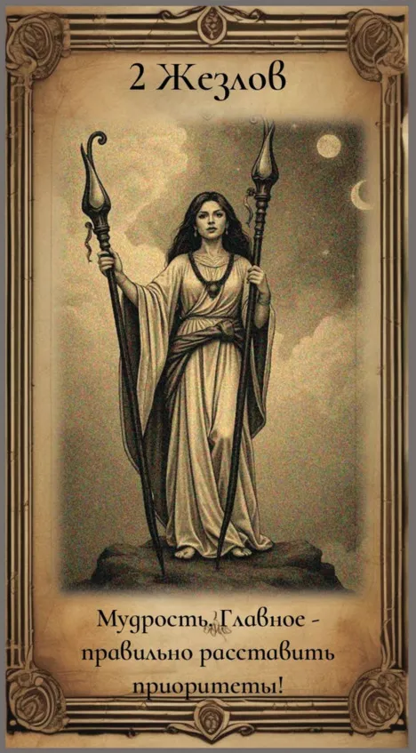 Двойка Жезлов символизирует выбор, планирование и перспективы. Эта карта часто указывает на момент, когда вы находитесь на развилке и вам нужно принять решение о будущем. Она может говорить о том, что у вас есть идеи и амбиции. Сейчас важно оценить свои возможности и построить стратегию для их реализации. У вас есть выбор вариантов. Главное – правильно расставить приоритеты. Это может говорить о том, что нужно расписать планы в правильном порядке, по важности их выполнения. На этой карте вам может даваться второй шанс, если вы упустили первый. Но только в том случае, если вы готовы приложить усилия. Вселенная даёт вам возможности, не упустите их.