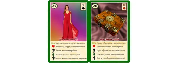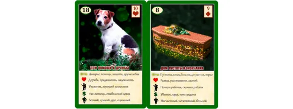 Ещё один пример показан на рис.4. Снова вспоминаем основные значения каждой отдельной карты. Карта Гроб обозначает болезнь, отсутствие или окончание чего-либо. Карта Собака обозначает помощь, друга или знакомого, а также непосредственно собаку. Теперь пробуем интерпретировать эту комбинацию.