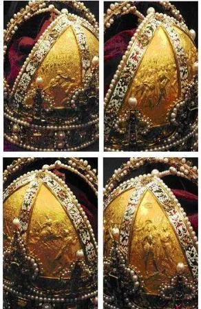 Митра. Символизирует божественное право управлять. Состоит из двух частей, между которыми идёт дуга от фронта до задней части, как в короне Карла Великого. Сделана из золота, по краю украшена эмалевой полосой с изображением птиц и цветов. Разделена на четыре секции, каждая из которых несёт на себе картины ключевых событий жизни Рудольфа II.
