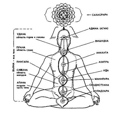 Ида и пингала, располагающиеся вдоль обеих сторон позвоночника, соответствуют центростремительным и центробежным нервным волокнам в грубом теле. Сушумна располагается в самом позвоночнике и является для йогинов наиважнейшей. Через нее импульсы должны идти от самой нижней муладхара чакры, находящейся внизу позвоночника, ниже гениталий, к самой верхней – сахасраре, располагающейся в головном мозгу.