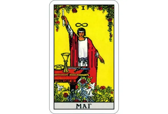 Символика: Мастерство, контроль над ситуацией, способность действовать эффективно. Мужчина с поднятыми руками, демонстрирующий своё мастерство управления энергиями и стихиями. Волшебный посох и символы четырёх стихий вокруг него. Бесконечность над головой.