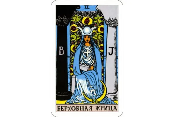 Символика: Интуиция, мудрость, внутреннее знание Женщина, сидящая между двумя колоннами, держащая свиток, закрытый завесой, символизирующей тайну.