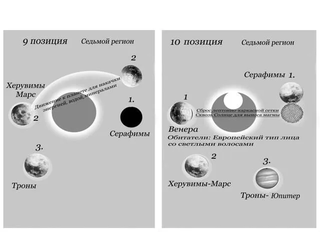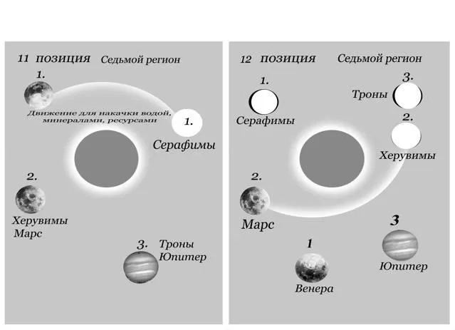 Позиция 11. Боги, т.е. Серафимы, Херувимы и Троны, выполнили задание Бога-отца. Создали все, что было запрограммировано. В центре стояло яркое палящее Солнце. Языки пламени просто качались вокруг ядра. В нашей Солнечной системе стояли три созданные планеты. Голубая планета Юпитер – создатели Троны. Желто-коричневая планета Марс – создатели Херувимы. Зеленая планета Венера – создатели Серафимы.