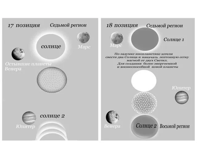Позиция 18. В Седьмом нашем регионе по задумке инопланетян, хотели свести два Солнца. Два Солнца должны были поделиться своей магмой для создания новой большой планеты.