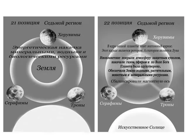 Позиция 21. После создания искусственного Солнца – все три Луны стояли вокруг нашей планеты Земля. (Тогда названия у нее не было). Это был большой огненный шар.