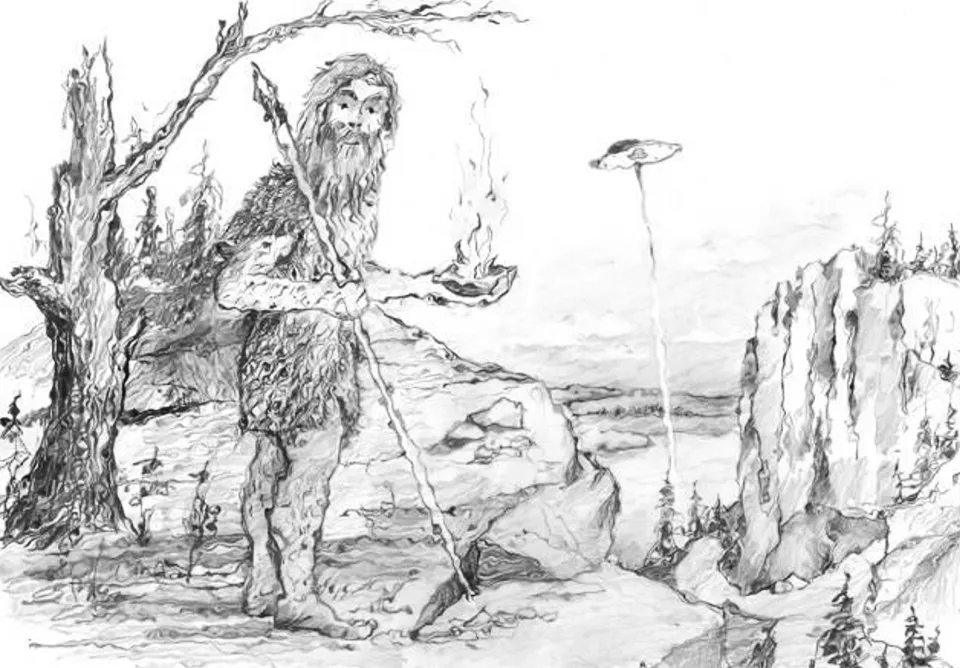 В чем была суть? Они привезли огонь Божий – воронка, а из нее вылетал огонь, как из бензореза. Так вот, они сказали, чтобы пользовались огнем и жарили на костре мясо. Разожгли костер, огонь воткнули в трещину камня, предупредили о пожаре. Сели в круглый огонь и улетели. После этого онемение тела прошло. В нашем племени появился огонь.