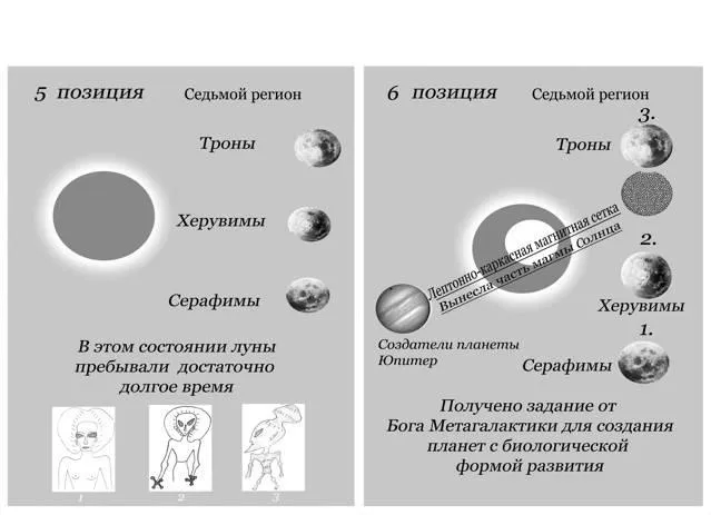 Позиция 5. Вот в такой позиции стояли Луны достаточно долгое время. Потом помню голос Отца – Бога – Логоса. Смысл сказанного не переведешь на наш язык. Было понятно, что Бог позвал все три луны к себе – Херувимов, Серафимов и Тронов, и они улетели.