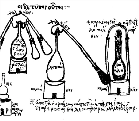 Перегонные кубы и сосуды для ферментации. Иллюстрация из алхимической рукописи Синезия на грече ском языке (Национальная библиотека, Париж; документ из собрания текстов древнегреческих алхимиков Марселена Бертло, 1887)