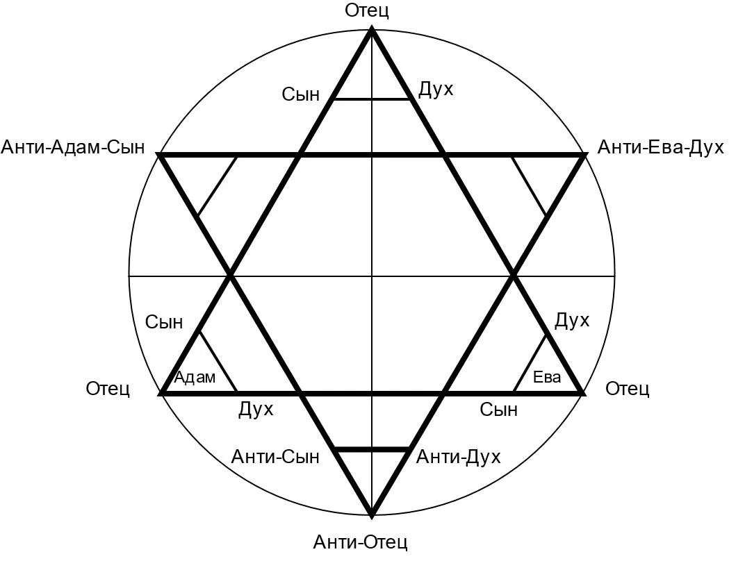Антимир, не выдерживая подобного давления сверху, вынужден был создать (а создавать он не умеет, только копирует) свой противовес, отсюда возник перевернутый, зеркальный треугольник, но не Божественный, а Голем от Антипода. В область Света поднялась линия «Анти-Адам— Анти-Ева», Троица вверх тормашками.