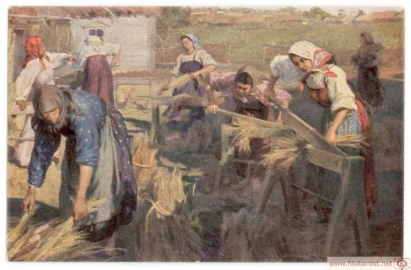 Федот В. Сычков. Трепание льна. Дореволюционная открытка.