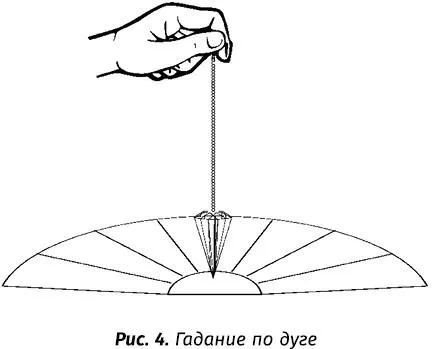 Кроме гадания, маятник можно использовать для определения оптимального времени воздействия кристалла или, проще говоря, сколько времени он должен оставаться на проблемном месте. Такая информация особенно важна, если вы носите кристалл на себе, помещаете его на какой-либо орган или рядом со своим телом, или около кровати. В этом случае будет правильным выяснить заранее, можно ли его оставлять на ночь или лучше снять (убрать). Вы получите ответ «да» или «нет», задав вопрос: «Должен ли я снять этот (название кристалла) на ночь?» Чтобы определить время воздействия, используйте дугу, на которой заранее следует отметить пятиминутные, часовые или однодневные интервалы, но прежде поинтересуйтесь, следует ли фиксировать период в минутах, часах или днях. Для этого удерживайте руку с маятником над центром дуги и просите указать на правильный период воздействия (см. рис. 4).