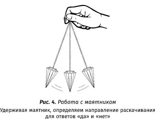 Договориться со своим маятником можно так: разместите его над вашим коленом и спросите: «Мое имя (ваше имя)..?» – направление, в котором он начнет качаться, будет означать «да». Затем, чтобы определить направление, означающее ответ «нет», спросите: «Мое имя (чужое имя)..?». Также вы можете сами запрограммировать маятник на ответы «да» и «нет», несколько раз качнув его в определенном направлении, уверенно скажите «да», качнув в другом – произнесите «нет» (см. рис. 4).