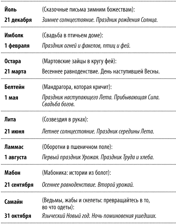 Но мы с вами будем находить разные соответствия к празднику и складывать пазл из разных магических кусочков с помощью подсознания. А чтобы вам было легче, я все же опишу основные детали для каждого из восьми праздников. Может быть, это и не пригодится и отмечать вы будете по старинке. Но если вы хотите поймать зимних фей, отправиться в путешествие в прошлое, попытаться создать гомункула, ухаживать за мандрагорами, общаться с божествами и следить за своим домом вместе с домовым во время Ламмаса – тогда вперед!