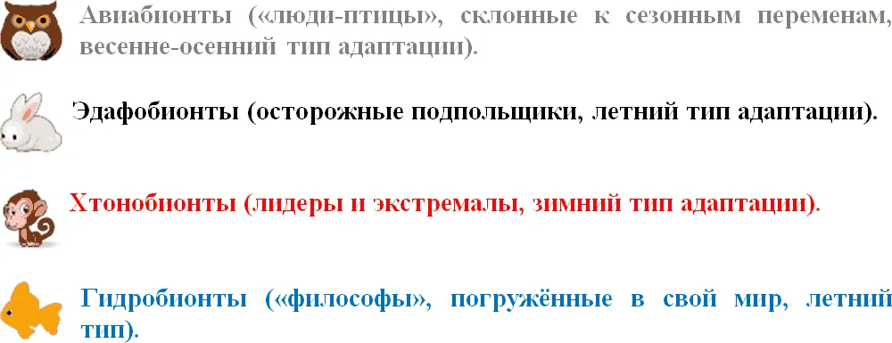 Скорей, это значит, что если качествами реагирования отдельный человек напоминает, скажем, птицу, то его качества связаны со стихией воздух и… разными оттенками белого цвета.