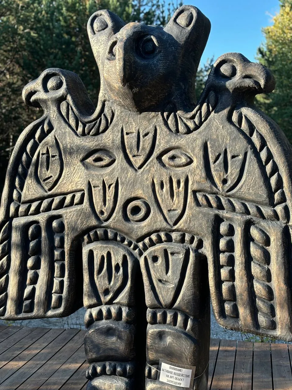 Мы с семьей живем недалеко от заповедной зоны, и когда я гуляла по пешеходной тропе, то увидела там скульптуру увеличенной в несколько раз детской игрушки древнего мальчика (написано: сына вождя).