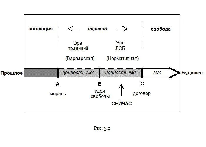 Впрочем, истина требует признать, что осмысленные цели разум начал ставить не сразу. Долгое время, назовем его «Эрой традиций», он освобождался наощупь. Это было время, когда люди только осваивались со своим разумом, и он действовал случайно, бесцельно и неосмысленно. Как это происходило? Мучительно (рис. 5.3, слева). Как в познании мира, повторяя тысячу раз какое-то действие, люди обнаруживали причинно-следственную связь позволяющую больше не повторяться, так и в общественной жизни, стремясь к выживанию и ударяясь тысячу раз лбами, они находили норму запрещающую дальнейшее соударение. Норма становилась традицией и передавалась потомкам. В силу такого неспешного способа познания, история и тянулась мучительно долго. Истинность найденных норм удостоверялась ощущениями действующих субьектов, крайней судьей которым являлась совесть. После чего цикл повторялся, а совесть воспринималась инструментом познания, что, конечно, вовсе не удивительно.