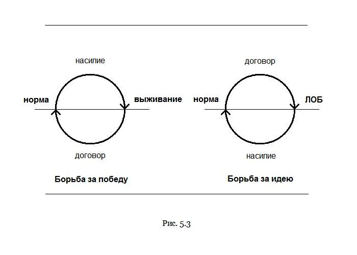 Зачем нужны размышления? Чтобы не заставлять совесть мучиться понапрасну. Если в отсутствии размышлений поиск норм представляет собой постоянную борьбу, то с размышлениями – борьбу спорадическую, способную время от времени сменяться одним только ненасильственным убеждением (рис. 5.2, точка В), а в перспективе вообще исчезнуть (точка С). Именно момент В можно считать настоящим поворотом к свободе. Традиции – это своего рода приобретенные инстинкты, отчего Эра традиций вполне может быть отнесена к био-эволюции. Совсем другое дело Эра ложных благ. Это уже работа разума. Размышления не только распознали насилие, но и позволили осознать необходимость его преодоления, чем воспользовались пророки, философы и идеологи, завалившие человечество своими вариантами ОБ, которые по большей части были ложными, хотя и живучими. Насаждение идей ОБ происходило путем сначала убеждения сторонников, а потом – насилия к несогласным, которое иногда оказывалось вполне демократическим, а иногда – немыслимо жестоким (рис. 5.3, справа). Но в любом случае очевидна роль разума не как инструмента удовлетворения любопытства и познания, а как орудия борьбы с насилием, где познание – лишь средство, хотя и существенное.