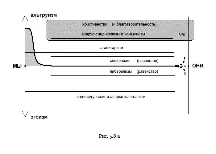 Прежде всего, линии, помеченные названиями вариантов насилия на рис. 5.8 – это целевые мотивы, которые безусловно могут отличаться от фактического результата. Например, в то время как христианство или коммунизм требуют максимального самопожертвования, люди в итоге на эти требования не обращают внимания. А если люди, напротив, пользуются принуждением других к своей выгоде, то в них и христианство, и коммунизм порождают эгоистичное поведение. Интересней случай, когда результат оказывается противоположным тому, каким его воспринимает субьект. Например, в случае либерализма, человек пользуется экономической свободой для реализации своего эгоистического интереса, но в итоге, по не зависящим от него причинам, оказывается эксплуатируемым и в хвост, и в гриву, т.е. является фактически альтруистом. Здесь мы и сталкиваемся с сутью проблемы. А суть – ложь идеологии. Чем ситуация либерализма отличается от прямого обмана? В итоге ничем. Что такое обман? Противоположность мотива и результата. Некто X предлагает Y отдать ему ценность N для того, чтобы получить потом ценность M, M > N. На какой мотив опирается обманщик? На рациональный, эгоистический. А в итоге? Когда Y отдает X N и ничего не получает взамен, он оказывается патологическим альтруистом.