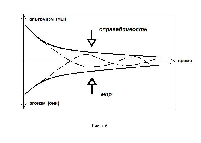 Является ли отмеченное совпадение между уменьшением накала чувств и ростом свободы случайным? Мне так не кажется. Есть определенная корреляция между степенью эгоизма/альтруизма, практикуемого людьми, и степенью насилия по отношению к другим/самому себе. Эгоизм/альтруизм – это моральная окраска мотивов, проявление морали в действиях, направленных на людей. Поэтому они определенно выливаются в то или иное воздействие, влияние и, следовательно, насилие. Мы можем заключить, что рис. 1.6 обнаружил некую прогрессивно-эволюционную тенденцию, связывающую моральные чувства и свободу. Свобода стремится привести людей в положение посторонних, тех, на кого можно не обращать внимания. Посторонний не покушается на других и другие не покушаются на него. Можно сказать – не вызывает никаких чувств, не требует никаких целенаправленных действий. Соответственно, можно сказать, что, на самом деле, рис. 1.6 показывает рост свободы в обществе – в виде уменьшения отклонения моральных мотивов со временем от точки их нулевого баланса, а также рост этичности среднего жителя, следующего нормам, а не подчиняющегося эмоциям.