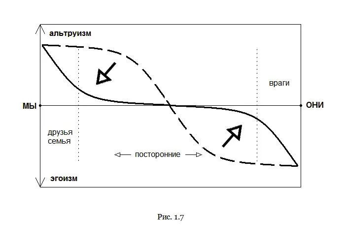 Динамику норм в расширяющемся коллективе тоже можно изобразить для полноты картины, рис. 1.8. Исходное состояние первобытного жестко коллективистского общества выглядит как массив суровых альтруистических традиций, скрывающих случайно найденные нормы. Постепенно традиции уступают место нормам, установленным и следуемым осознанно, нормы как бы освобождаются от груза случайного и становятся тем, что они есть на самом деле – идеями, и будучи идеями, они оформляются в законы, не обязательно письменные. Тут надо отметить несколько важных деталей. Во-1-х, больший коллектив означает больший пласт накопленной культуры, большее количество традиций, и вытекающее большее своеобразие каждого человека, просто физически не способного знать их все. Общих традиций становится меньше – в этом, собственно и заключается понятие чужеродности, с чужими меньше традиционно общего и больше формально нормативного. Большой коллектив приобретает черты космополитичности и мультикультурности. Поэтому, во-2-х, общие нормы унифицируются, становятся более обьективными, не зависящими от исторических казусов и личных пристрастий, приближаются к универсальному этическому ядру. Иначе коллектива надолго не получится. В-3-х, этот процесс демонстрирует перемешивание коллектива, увеличение числа контактов между посторонними членами общества, формализацию норм в праве. В-4-х, чертеж отражает превращение жесткого насильственного коллектива в гибкое динамичное общество, где быстро создаются новые структуры и институты, отвечающие требованиям времени. И самое главное, в-5-х, увеличение количества норм – это ослабление произвола, укрепление законности и рост свободы.